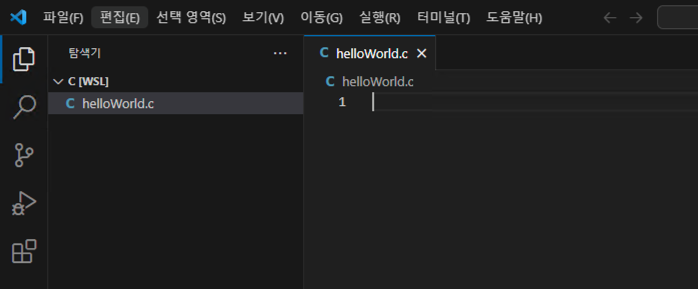 탐색기에서 새 파일을 클릭하여 helloWorld.c 파일을 만들어 줍니다.