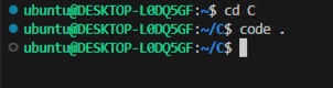 cd 명령어를 통해 아까 만들었던 C 폴더로 이동하여 다시 code. 명령어를 통해 VSCode를 열어줍니다.